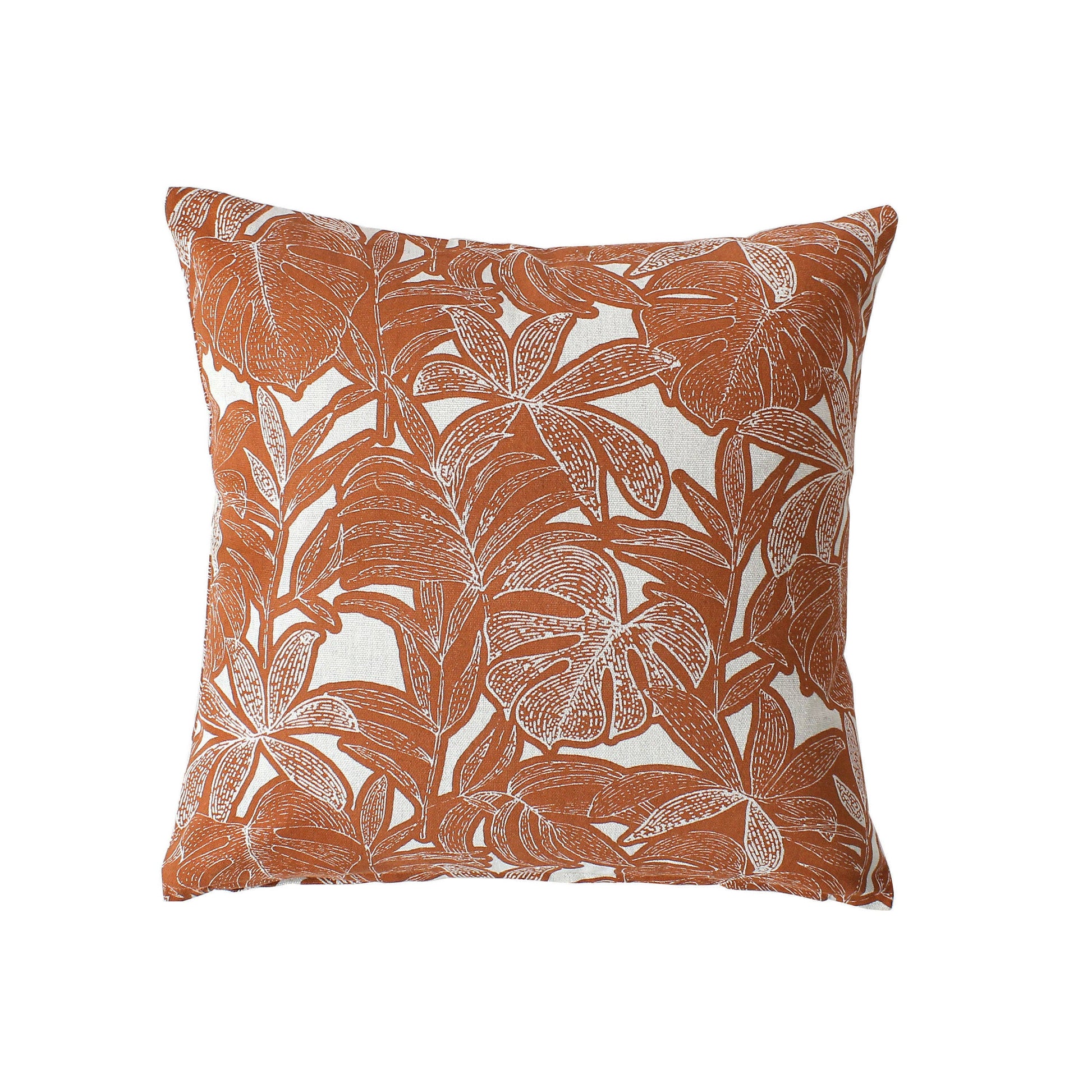 Ce coussin amène de la joie à nos salons et chambres avec son imprimé feuillages tropicaux et ses tons cuivrés.