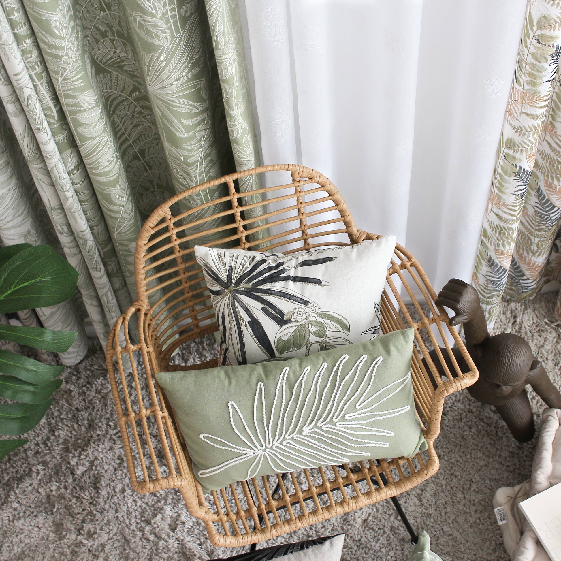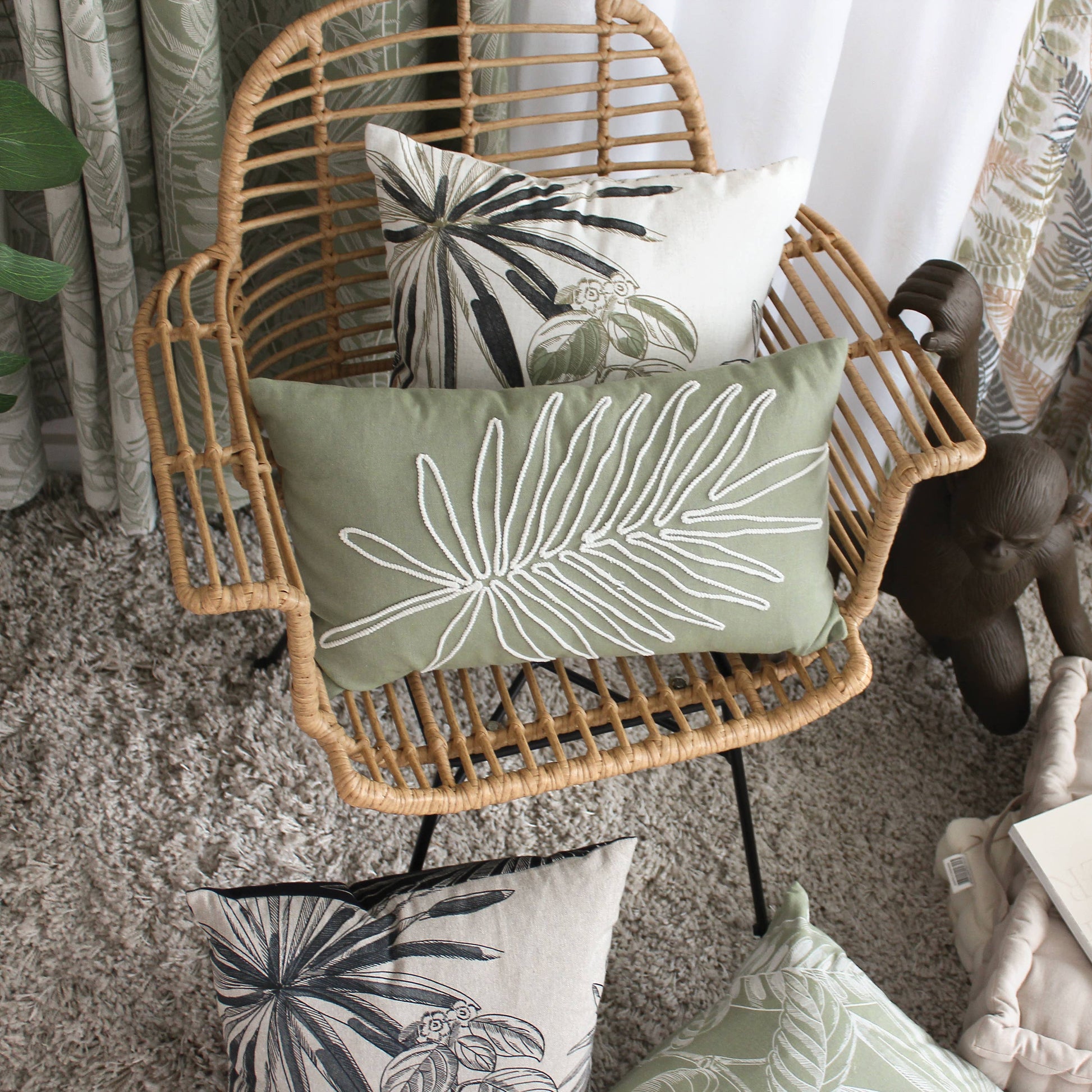 Ce coussin apporte une décoration exotique et raffinée avec sa broderie feuille en fil chenille écru.