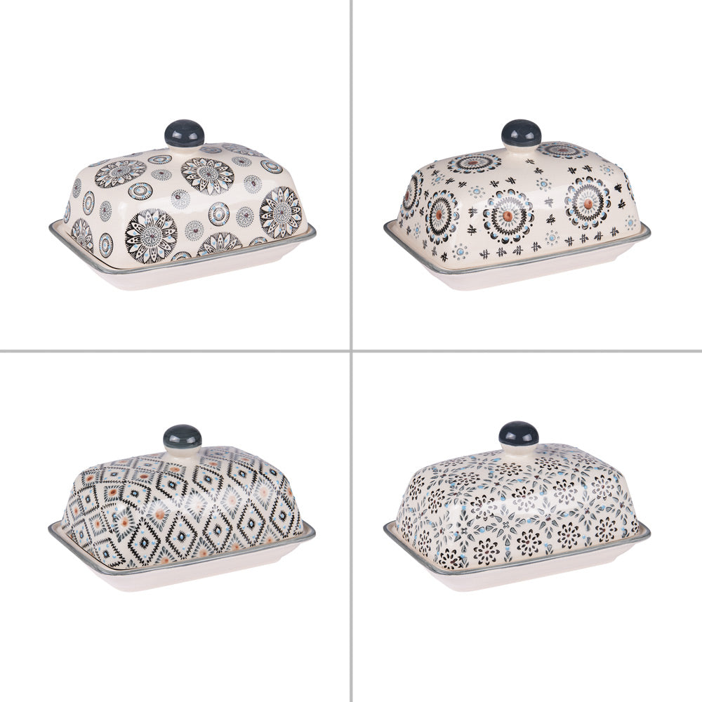 La collection Nelson est entièrement peinte à la main et composée de grès artisanal aux décors assortis ornés de délicats motifs réhaussés de petits points de couleurs en relief.